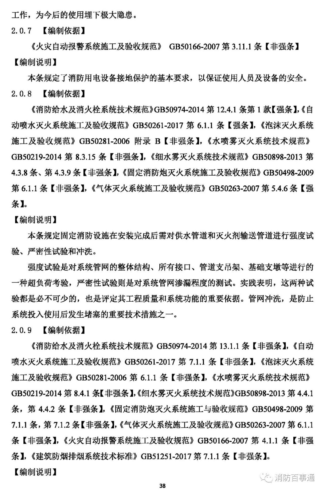 2.0.8 室內(nèi)外消火栓系統(tǒng)中的消防給水管道、固定消防設(shè)施中的供水管道和滅火劑輸送管道,在安裝后應(yīng)進(jìn)行強(qiáng)度試驗(yàn)、嚴(yán)密性試驗(yàn)和沖洗。