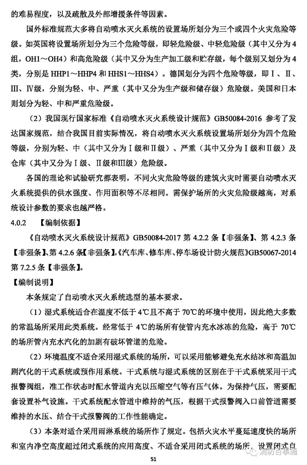 4.0.2 環(huán)境溫度不低于 4℃、且不高于70℃的場(chǎng)所應(yīng)采用濕式系統(tǒng);環(huán)境溫度低于4℃、或高于70℃的場(chǎng)所應(yīng)采用干式系統(tǒng);