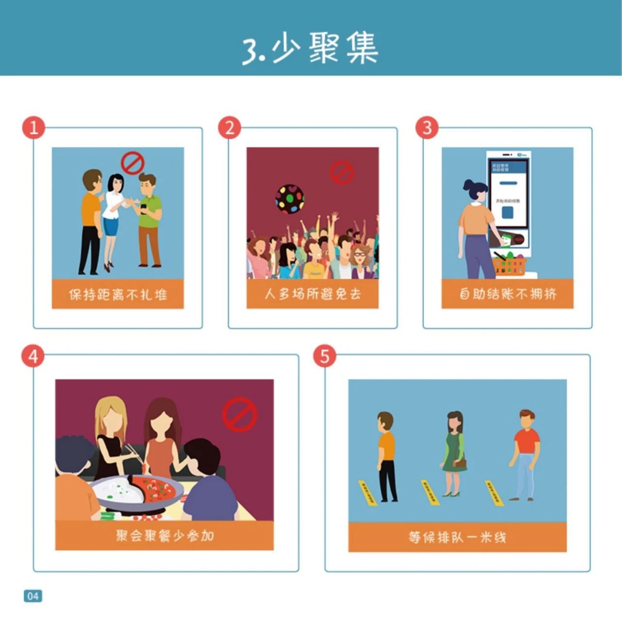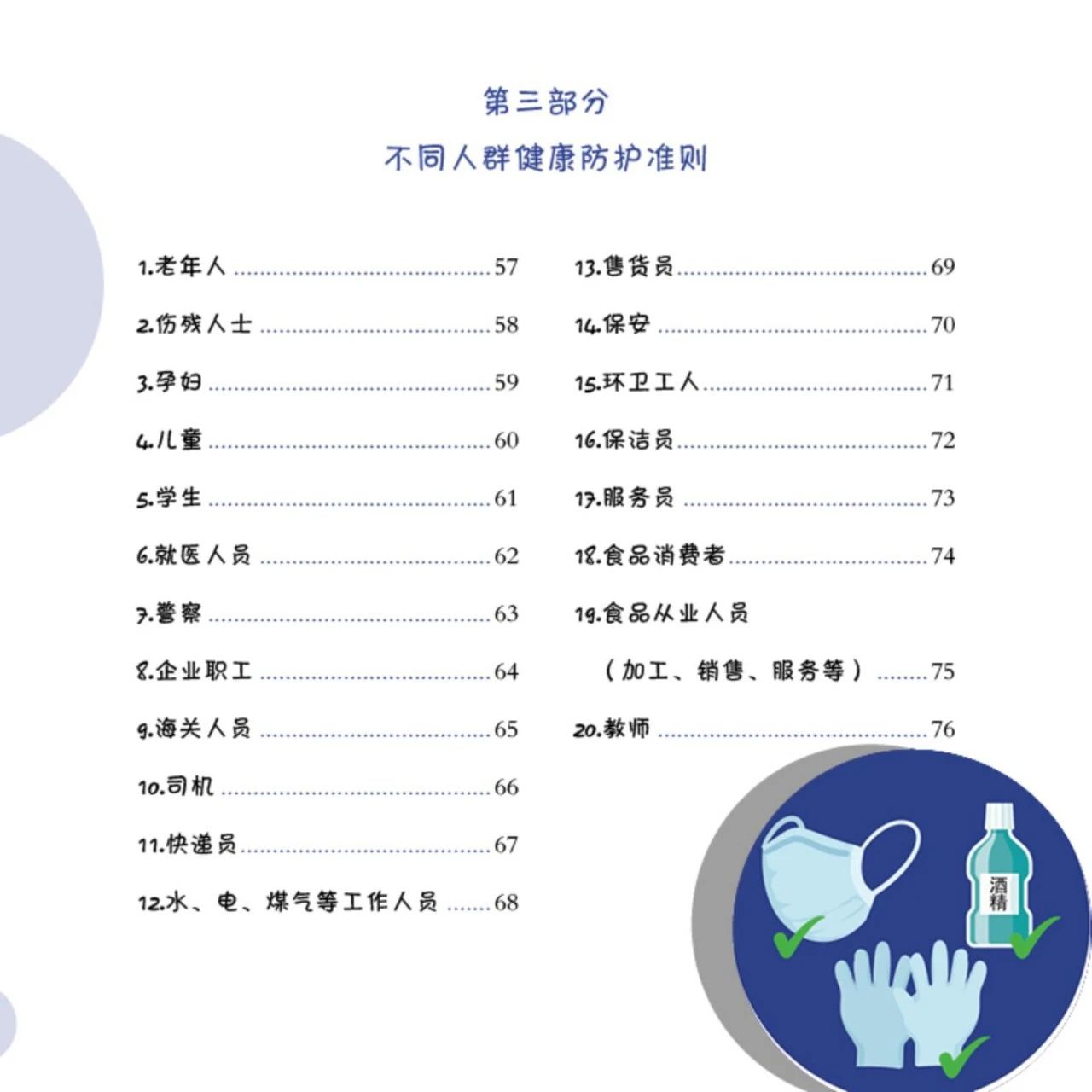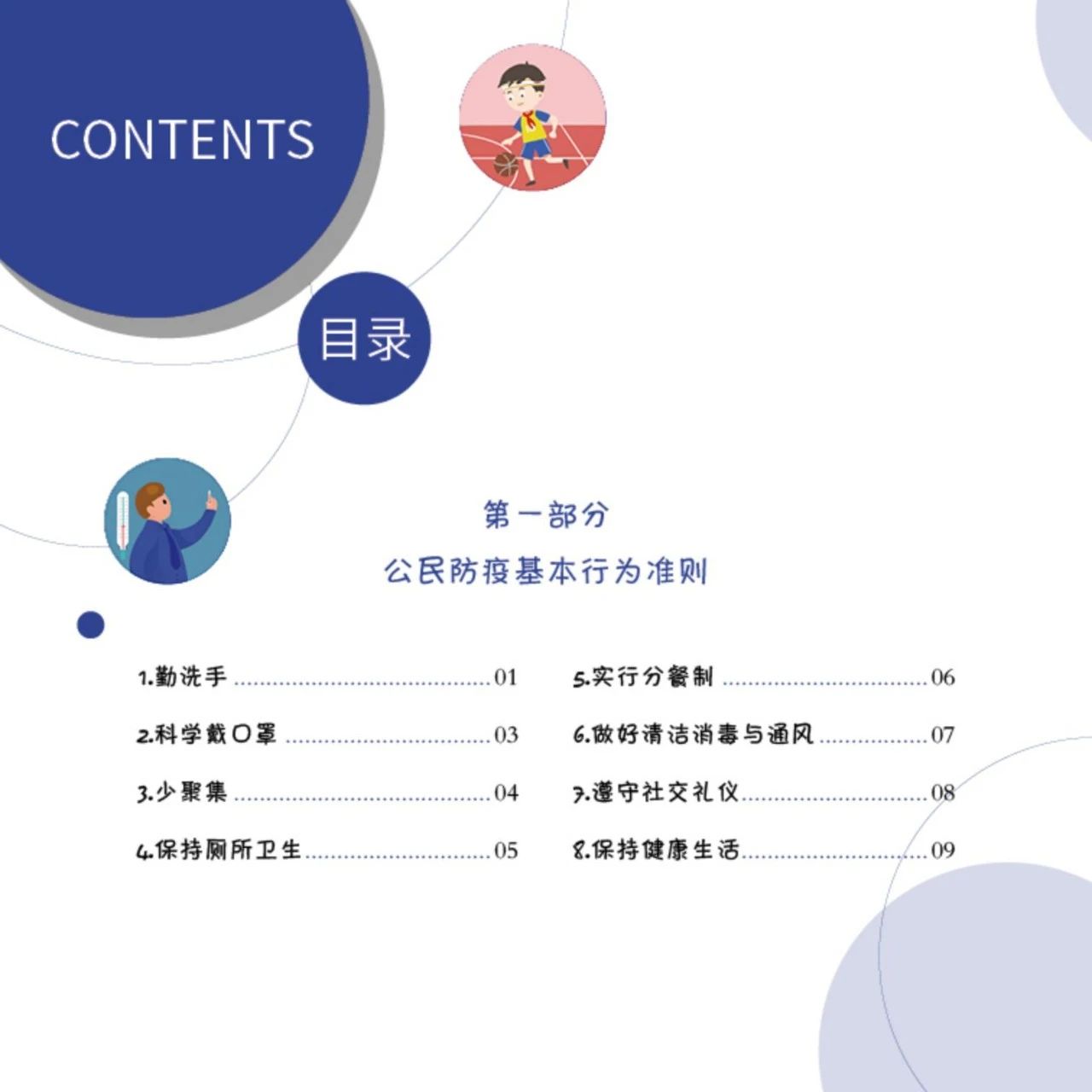 《公民防疫行為準(zhǔn)則》(科普版)共三部分73類。 第一部分為公民防疫基本行為準(zhǔn)則,包括勤洗手、戴口罩、少聚集、分餐制、社交禮儀以及廁所衛(wèi)生、通風(fēng)與消毒、健康生活等八方面; 第二部分和第三部分針對(duì)重點(diǎn)場(chǎng)所、重點(diǎn)人群主動(dòng)防疫的關(guān)鍵風(fēng)險(xiǎn)點(diǎn),對(duì)不同場(chǎng)景、不同人群提出健康防護(hù)準(zhǔn)則。 旨在通過(guò)圖文并茂、貼近生活的形式,讓公眾看得懂、易接受、記得牢、做得到,將公民防疫行為準(zhǔn)則作為一種社會(huì)文明風(fēng)尚和健康生活方式,持久地堅(jiān)持下去、推廣開(kāi)來(lái)。