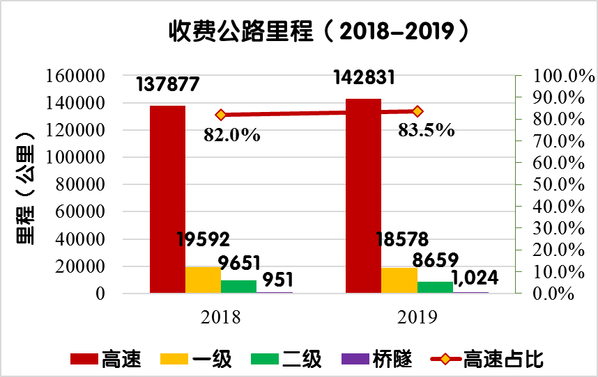 2019年末,全國(guó)收費(fèi)公路里程17.11萬公里,占公路總里程501.25萬公里的3.4%。其中,高速公路14.28萬公里,一級(jí)公路1.86萬公里,二級(jí)公路0.87萬公里,獨(dú)立橋梁及隧道1024公里,占比分別為83.5%、10.9%、5.1%和0.6%。