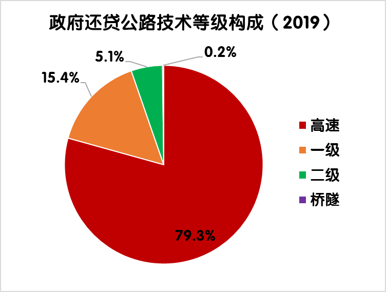 2019年末,全國(guó)政府還貸公路里程9.39萬公里,占全國(guó)收費(fèi)公路里程的54.9%。其中,政府還貸高速公路7.45萬公里,一級(jí)公路1.44萬公里,二級(jí)公路0.48萬公里,獨(dú)立橋梁及隧道186公里,占比分別為79.3%、15.4%、5.1%和0.2%。政府還貸高速公路占收費(fèi)高速公路里程的52.1%。