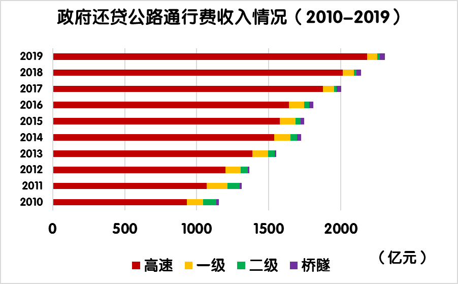 2019年度,全國(guó)經(jīng)營(yíng)性公路收支平衡結(jié)果為-2334.9億元。其中,經(jīng)營(yíng)性高速公路收支缺口2284.7億元,一級(jí)公路收支缺口53.1億元,二級(jí)公路收支缺口3.7億元,獨(dú)立橋梁及隧道收支盈余6.6億元。