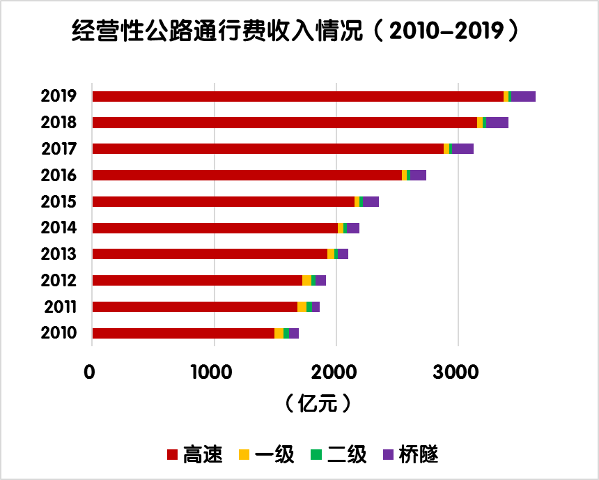 與上年相比,經(jīng)營(yíng)性公路車輛通行費(fèi)總收入由3410.1億元增加到3628.9億元,凈增218.7億元,增長(zhǎng)6.4%。其中,高速公路由3152.4億元增加到3368.1億元,凈增215.7億元,增長(zhǎng)6.8%;一級(jí)公路由48.0億元減少到41.9億元,凈減6億元,下降12.6%;二級(jí)公路由25.4億元減少到23.5 億元,凈減1.9億元,下降7.6%;獨(dú)立橋梁及隧道由184.3億元增加到195.3億元,凈增11億元,增長(zhǎng)6.0%。