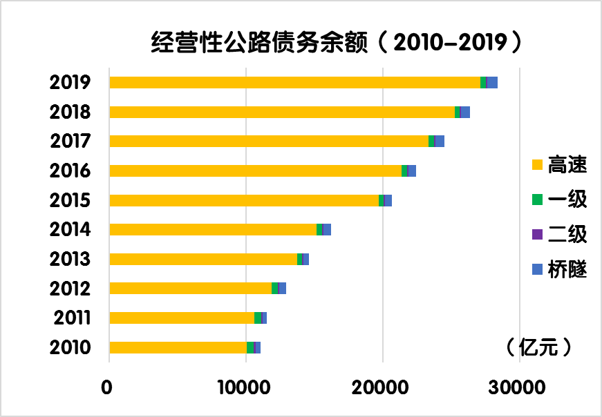 與上年末相比,經(jīng)營(yíng)性公路債務(wù)余額由26377.5億元增加到28387.6 億元,凈增2010.1 億元,增長(zhǎng)7.6%。其中,經(jīng)營(yíng)性高速公路債務(wù)余額由25245.9 億元增加到27154.9 億元,凈增1909.0 億元,增長(zhǎng)7.6%。