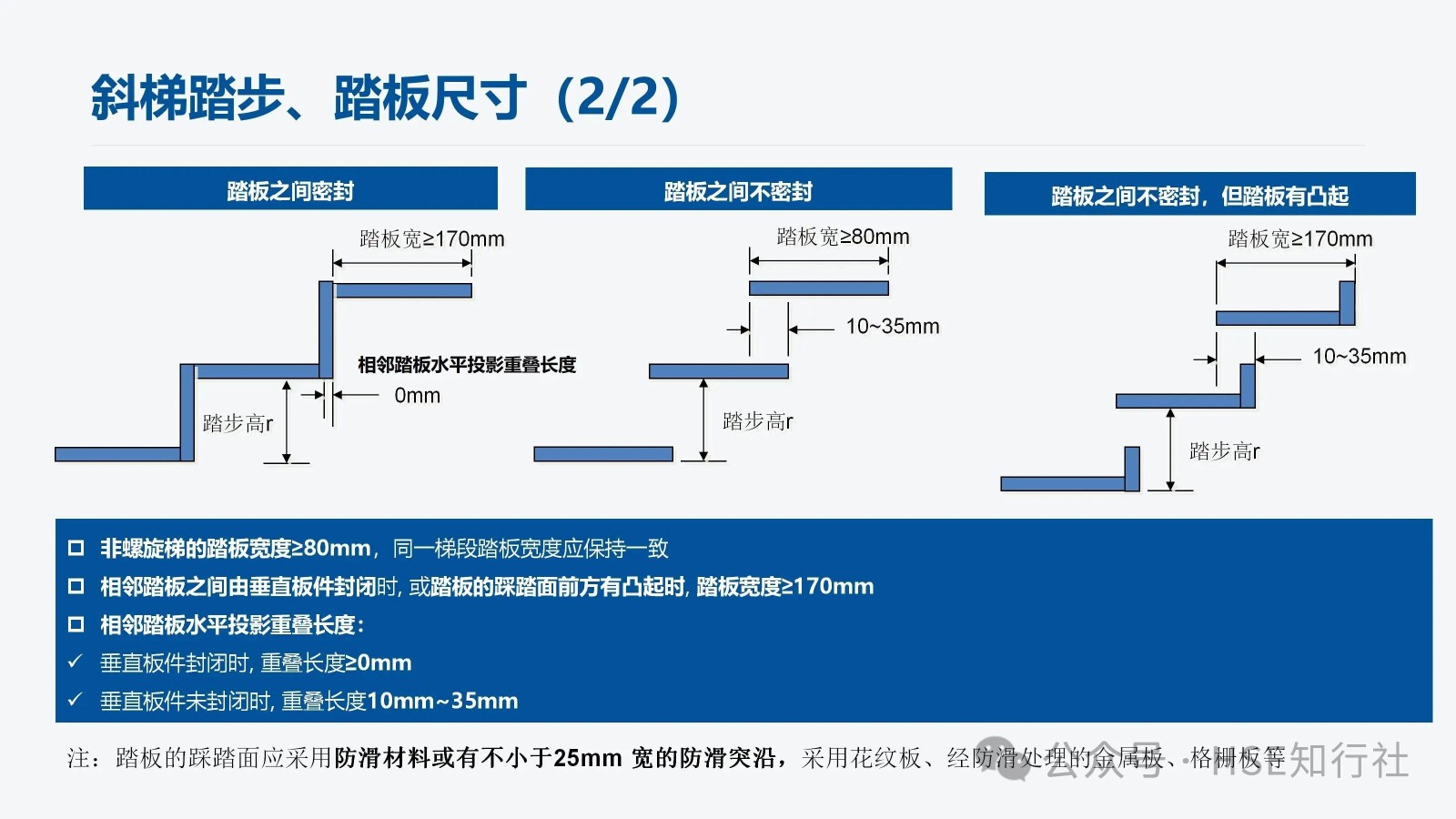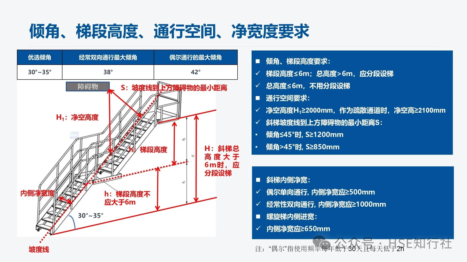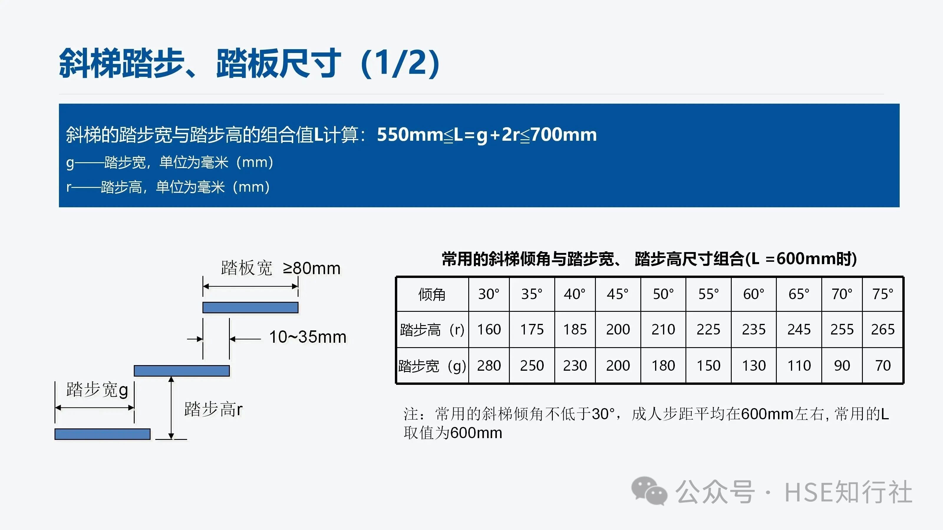 適用范圍 適用于工業(yè)企業(yè)內工作場所中使用的固定式金屬斜梯的設計、制造和安裝。不適用于安裝在核設施、船舶、 起重機械、輸電塔上的固定式金屬斜梯。 傾角、梯段高度、通行空間、凈寬度要求 傾角、梯段高度要求: 梯段高度≤6m;總高度>6m,應分段設梯。 總高度≤6m,不用分段設梯。 通行空間要求: 凈空高度:H1≥2000mm,作為疏散通道時,凈空高≥2100mm 斜梯坡度線到上方障礙物的最小距離S: 傾角≤45°時, S≥1200mm 傾角>45°時, S≥850mm 斜梯內側凈寬: 偶爾單向通行, 內側凈寬應≥500mm 經常性雙向通行, 內側凈寬應≥1000mm 螺旋梯內側進寬: 內側凈寬應≥650mm 注:“偶爾”指使用頻率每年低于30天且每天低于2h。 傾角要求: 優(yōu)選傾角:30°~35° 經常雙向通行最大傾角:38° 偶爾通行的最大傾角:42° 斜梯踏步、踏板尺寸 平臺設置要求: 1、斜梯的踏步寬與踏步高的組合值L計算: 550mm≦L=g+2r≦700mm g——踏步寬,單位為毫米(mm) r——踏步高,單位為毫米(mm) 2、常用的斜梯傾角與踏步寬、踏步高尺寸組合(L =600mm時): 傾角 30° 35° 40° 45° 50° 55° 60° 65° 70° 75° 踏步高(r) 160 175 185 200 210 225 235 245 255 265 踏步寬(g) 280 250 230 200 180 150 130 110 90 70 注:常用的斜梯傾角不低于30°,成人步距平均在600mm左右, 常用的L取值為600mm。 3、不同踏板形式的踏板寬度、相鄰踏板水平投影長度也不相同,具體如下: 踏板之間封閉: 踏板之間不封閉: 踏板之間不封閉,但踏板有凸起: 非螺旋梯的踏板寬度≥80mm,同一梯段踏板寬度應保持一致。 相鄰踏板之間由垂直板件封閉時, 或踏板的踩踏面前方有凸起時, 踏板寬度≥170mm。 相鄰踏板水平投影重疊長度: 1、垂直板件封閉時, 重疊長度≥0mm 2、垂直板件未封閉時, 重疊長度10mm~35mm 注:踏板的踩踏面應采用防滑材料或有不小于25mm 寬的防滑突沿,采用花紋板、經防滑處理的金屬板、格柵板等。 螺旋梯踏步、踏板尺寸 距離螺旋梯扇形踏步窄邊300mm處的踏步寬應不小于170mm。 螺旋梯的踏步高應在160mm~240mm范圍內。 螺旋梯同一梯段踏板的平面投影圓心角應保持一致(梯段頂部踏板除外)。 防護欄桿與扶手 防護欄桿設置: 當斜梯側面敞開邊緣的臨空高度≥1200mm時, 敞開邊緣應設置防護欄桿。 傾角≤45°的斜梯, 防護欄桿立柱應垂直于踏板, 并從第一級踏板起始設置。 傾角>45°的斜梯: 1、防護欄桿立柱垂直于踏板時, 立柱從第一級踏板起始設置。 2、防護欄桿立柱垂直于起坡線時,起始位置設置要滿足以下要求: 下方工作面有防護欄時,起點與防護欄頂部橫桿連接。 下方工作面無防護欄時,起點距離工作面豎向距離≤1200mm。 立桿垂直于起坡線,下方有護欄 立桿垂直于起坡線,下方無護欄 扶手設置: 扶手設置主要根據(jù)斜梯的傾角、斜梯的梯寬來設置,設置要求如下圖: 斜梯防護欄桿高度≤1200mm時, 頂部橫桿兼做扶手。 單獨設置斜梯扶手時, 扶手豎直高度為860mm~1000mm。 扶手起始點距離地面或平臺的垂直距離應≤1000mm。 梯間平臺與門 梯間平臺: 1、梯間平臺寬度應不小于梯子寬度, 對斜梯應不小于760mm 。 2、梯間平臺在行進方向上的長度應不小于梯子寬度, 對斜梯應不小于850mm。 3、梯間平臺要符合GB4053.3—2025的規(guī)定。 自閉門: 1、自行關閉、保持在關閉位置但不鎖定。 2、采用平開方式向平臺內打開、打開角度不小于 90°。 3、關閉時由擋塊阻擋,防止人員推開發(fā)生墜落或其他意外傷害。 4、不設置踢腳板、底部距離平臺高度為120mm~500mm。 5、自閉門要符合GB4053.3—2025的規(guī)定。 荷載 梯梁、踏板、頂部橫桿、中間桿、立柱荷載如下: 1、梯寬<1200mm 時, 非螺旋梯踏板應承受跨中100mm×100mm 區(qū)域上作用≥1.5kN集中活荷載。 2、梯寬梯寬≥1200mm時, 非螺旋梯踏板應承受跨中間隔600mm的兩100mm×100mm區(qū)域上同時作用≥1.5kN集中活荷載。 3、螺旋梯的踏板應承受靠近外側邊緣100 mm×100mm 區(qū)域上作用不小于1.5kN 集中活荷載。 使用說明和警示信息 斜梯的使用說明和警示信息,主要從“斜梯的使用說明”、“斜梯的警示信息”、“自閉門的警示信息”三方面來完善,同時涉及到的安全色和安全標志應符合 GB2894 的規(guī)定。 1、斜梯的使用說明,包括但不限以下內容: a) 斜梯、平臺的最大允許荷載.。 b) 自閉門的安全使用信息。 c) 維護和檢查的要求。 需要設計、制造方提供使用說明。 2、斜梯的警示信息,包括但不限以下內容: a)最大荷載信息(包括允許的最大負載人數(shù)、工具和裝備等最大附加荷載)。 b)人員攀登時的安全要求(例如當心墜落、必須戴安全帽等)。 3、自閉門的警示信息,包括但不限以下內容: a)禁止倚靠的信息。 b)小心墜落的信息。 c) 提示非通行狀態(tài)保持關閉。