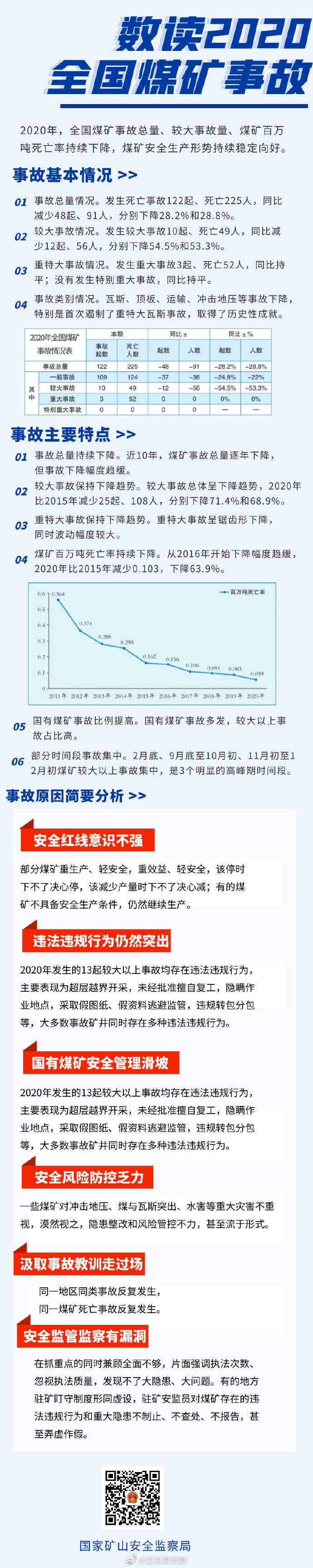 2020年,面對極其嚴(yán)峻復(fù)雜的國內(nèi)外形勢,特別是新冠肺炎疫情的嚴(yán)重沖擊,在黨中央、國務(wù)院的堅強(qiáng)領(lǐng)導(dǎo)下,各地區(qū)、各有關(guān)部門和廣大煤礦企業(yè)統(tǒng)籌抓好疫情防控和安全生產(chǎn)工作,全國煤礦事故總量、較大事故量、煤礦百萬噸死亡率持續(xù)下降,煤礦安全生產(chǎn)形勢持續(xù)穩(wěn)定向好。