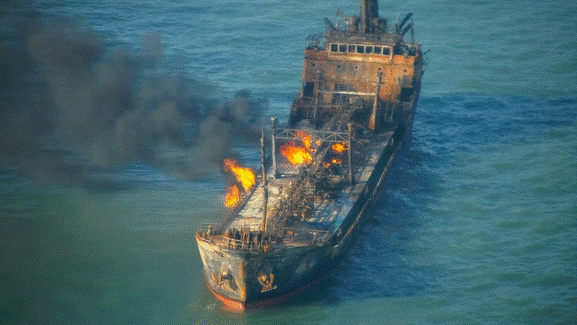 正在燃燒的“隆慶1號”油船