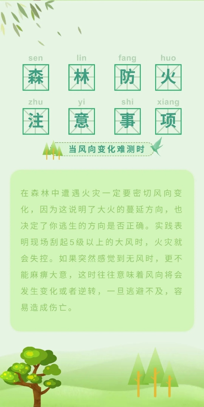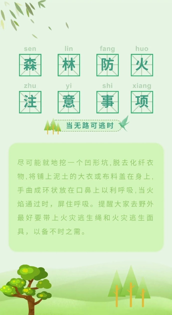 步入三月份以來(lái),全國(guó)各地氣溫回升,物種植被干燥,火險(xiǎn)等級(jí)逐步升高,給森林防火滅火帶來(lái)嚴(yán)峻考驗(yàn)。那么,普通群眾遇到森林火災(zāi)時(shí),該如何最大限度的減小森林火災(zāi)對(duì)自身的危害呢?這些森林火災(zāi)基本逃生方法,一定要記住哦!(甘肅省森林消防總隊(duì)平?jīng)鲋ш?duì)駐黃陵分隊(duì):倪騰飛)