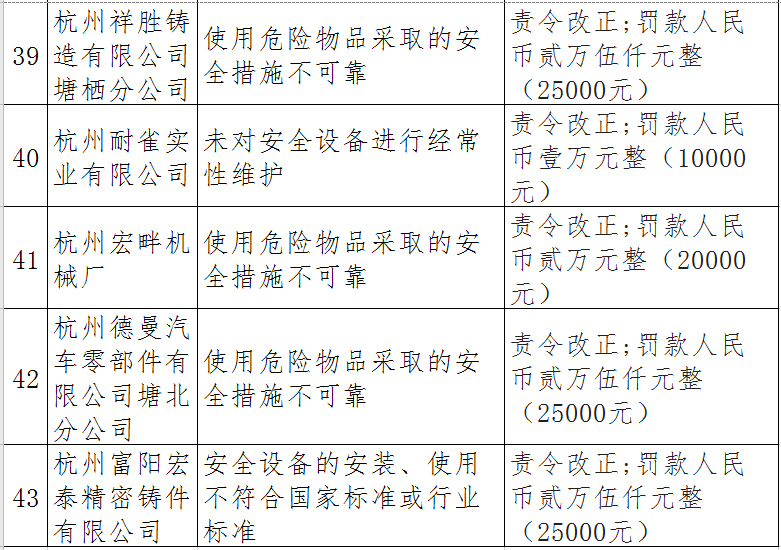 據(jù)了解,今年上半年,杭州市應(yīng)急管理局一手抓駐企復(fù)工復(fù)產(chǎn)、一手抓安全生產(chǎn),已完成年度執(zhí)法計(jì)劃、專項(xiàng)檢查、聯(lián)合執(zhí)法、信訪舉報(bào)核查等,并對(duì)檢查中發(fā)現(xiàn)的安全生產(chǎn)違法違規(guī)企業(yè)(個(gè)人)進(jìn)行了處罰?,F(xiàn)對(duì)52家被行政處罰的企業(yè)(個(gè)人)進(jìn)行曝光,希望各企業(yè)引以為戒!