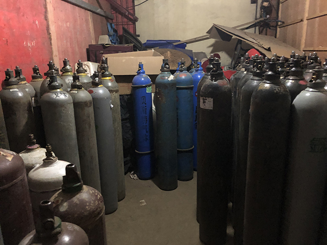 浙江杭州市案例:2021年3月8日上午,浙江省杭州市蕭山區(qū)應(yīng)急管理局執(zhí)法人員對某公司進(jìn)行執(zhí)法檢查。期間,執(zhí)法人員發(fā)現(xiàn)廠區(qū)內(nèi)一簡易鋼棚搭設(shè)的倉庫,玻璃窗均被物體人為遮擋,檢查發(fā)現(xiàn)倉庫內(nèi)堆放了大量?;?,包括滿瓶二氧化碳、氧氣、乙炔、混合氣體、氮?dú)獾?span style="margin-bottom: 37px;line-height: 37px;font-size: 21px">176個氣瓶。同時,該倉庫緊鄰公司員工宿舍樓搭設(shè),宿舍樓里還住著數(shù)十個工人,一旦發(fā)生爆炸,后果不堪設(shè)想。
