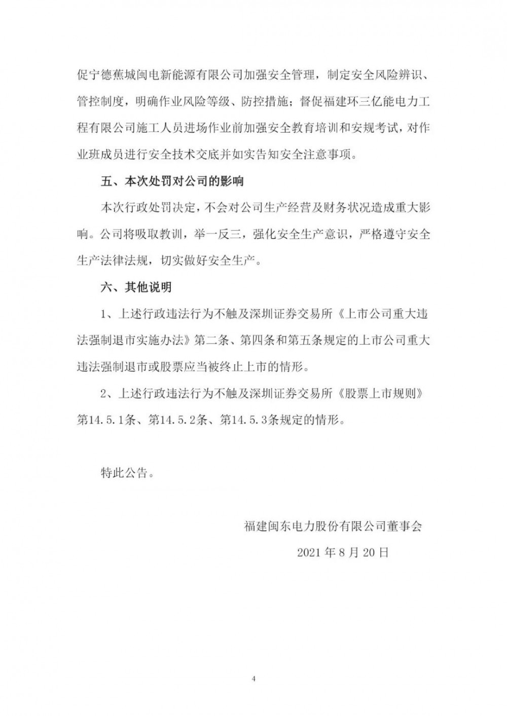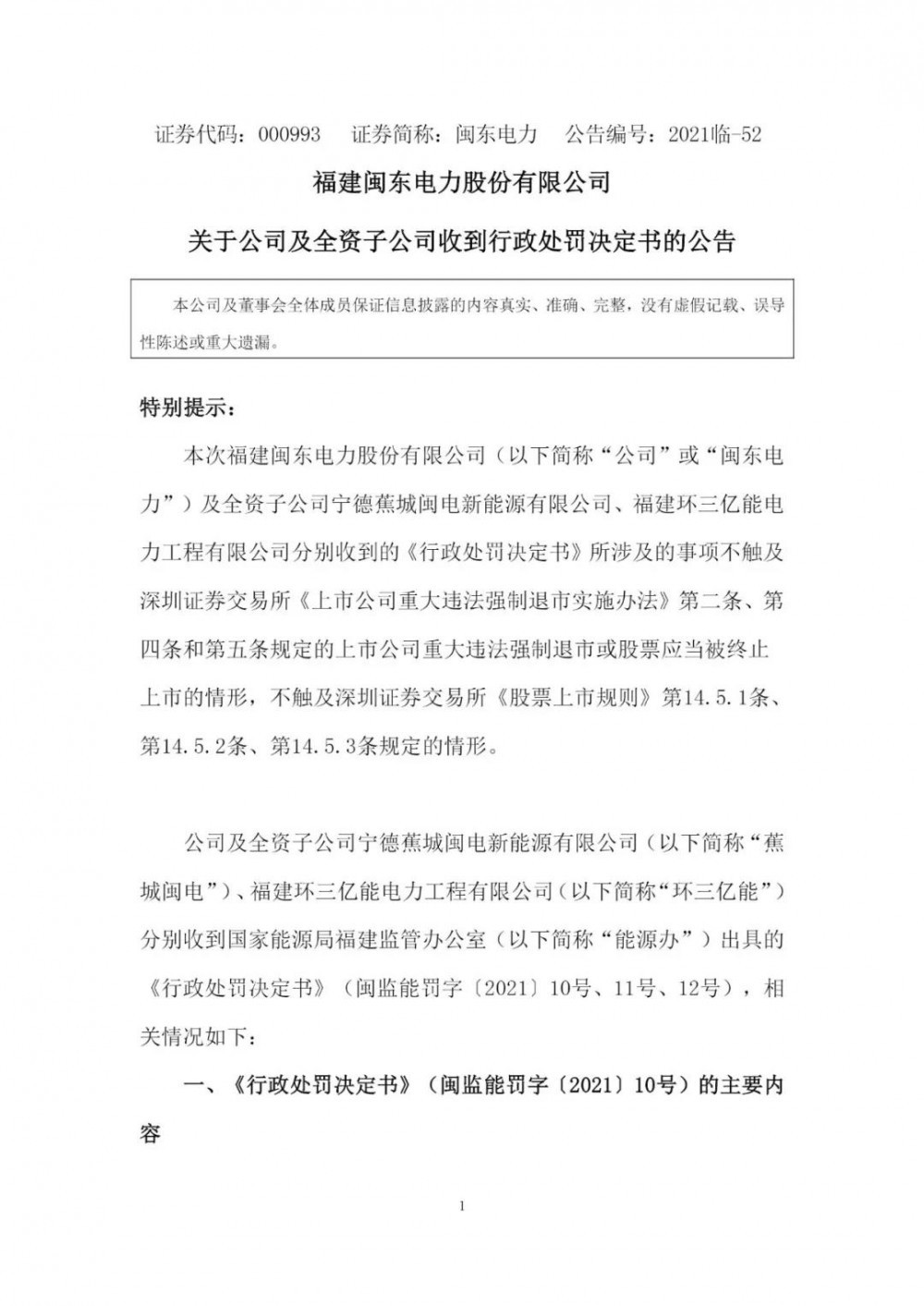 近日,福建閩東電力股份有限公司(以下簡稱“閩東電力”)向社會公眾披露了《關(guān)于公司及全資子公司收到行政處罰決定書的公告》,閩東電力及旗下全資子公司寧德蕉城閩電新能源有限責(zé)任公司(以下簡稱“蕉城閩電”)、福建環(huán)三億能電力工程有限公司(以下簡稱“環(huán)三億能”)分別收到國家能源局福建監(jiān)管辦公室簽發(fā)的《行政處罰決定書》。