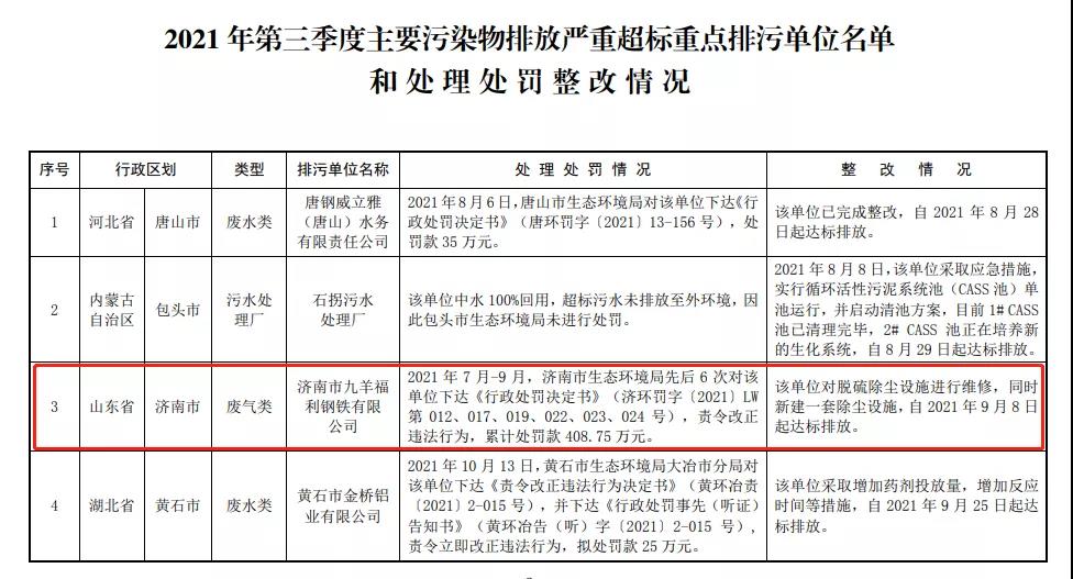 近日,生態(tài)環(huán)境部公布2021年第三季度主要污染物排放嚴(yán)重超標(biāo)重點(diǎn)排污單位名單和處理處罰整改情況。其中,濟(jì)南市九羊福利鋼鐵有限公司因廢氣類(lèi)污染等環(huán)境違法行為,累計(jì)處罰款408.75萬(wàn)元。