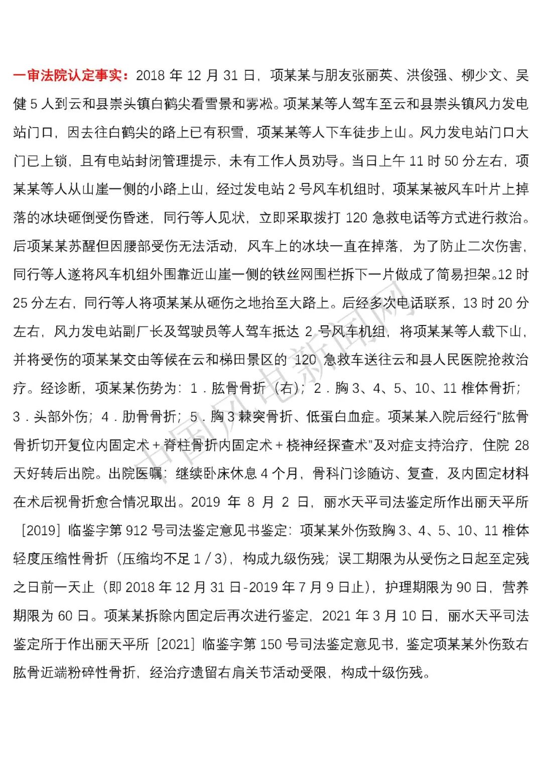 法院認定事實:2018年12月31日,項建英與朋友張麗英、洪俊強、柳少文、吳健5人到云和縣崇頭鎮(zhèn)白鶴尖看雪景和霧凇。項建英等人駕車至云和縣崇頭鎮(zhèn)風力發(fā)電站門口,因去往白鶴尖的路上已有積雪,項建英等人下車徒步上山。風力發(fā)電站門口大門已上鎖,且有電站封閉管理提示,未有工作人員勸導。當日上午11時50分左右,項建英等人從山崖一側(cè)的小路上山,經(jīng)過發(fā)電站2號風車機組時,項建英被風車葉片上掉落的冰塊砸倒受傷昏迷,同行等人見狀,立即采取撥打120急救電話等方式進行救治。后項建英蘇醒但因腰部受傷無法活動,風車上的冰塊一直在掉落,為了防止二次傷害,同行等人遂將風車機組外圍靠近山崖一側(cè)的鐵絲網(wǎng)圍欄拆下一片做成了簡易擔架。12時25分左右,同行等人將項建英從砸傷之地抬至大路上。后經(jīng)多次電話聯(lián)系,13時20分左右,風力發(fā)電站副廠長及駕駛員等人駕車抵達2號風車機組,將項建英等人載下山,并將受傷的項建英交由等候在云和梯田景區(qū)的120急救車送往云和縣人民醫(yī)院搶救治療。經(jīng)診斷,項建英傷勢為:1.肱骨骨折(右);2.胸3、4、5、10、11椎體骨折;3.頭部外傷;4.肋骨骨折;5.胸3棘突骨折、低蛋白血癥。項建英入院后經(jīng)行“肱骨骨折切開復位內(nèi)固定術+脊柱骨折內(nèi)固定術+橈神經(jīng)探查術”及對癥支持治療,住院28天好轉(zhuǎn)后出院。出院醫(yī)囑:繼續(xù)臥床休息4個月,骨科門診隨訪、復查,及內(nèi)固定材料在術后視骨折愈合情況取出。2019年8月2日,麗水天平司法鑒定所作出麗天平所[2019]臨鑒字第912號司法鑒定意見書鑒定:項建英外傷致胸3、4、5、10、11椎體輕度壓縮性骨折(壓縮均不足1/3),構(gòu)成九級傷殘;誤工期限為從受傷之日起至定殘之日前一天止(即2018年12月31日-2019年7月9日止),護理期限為90日,營養(yǎng)期限為60日。項建英拆除內(nèi)固定后再次進行鑒定,2021年3月10日,麗水天平司法鑒定所于作出麗天平所[2021]臨鑒字第150號司法鑒定意見書,鑒定項建英外傷致右肱骨近端粉碎性骨折,經(jīng)治療遺留右肩關節(jié)活動受限,構(gòu)成十級傷殘。