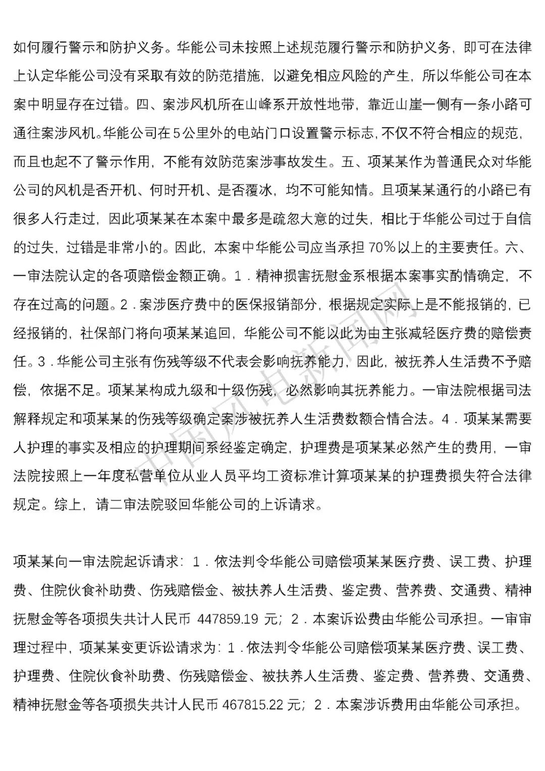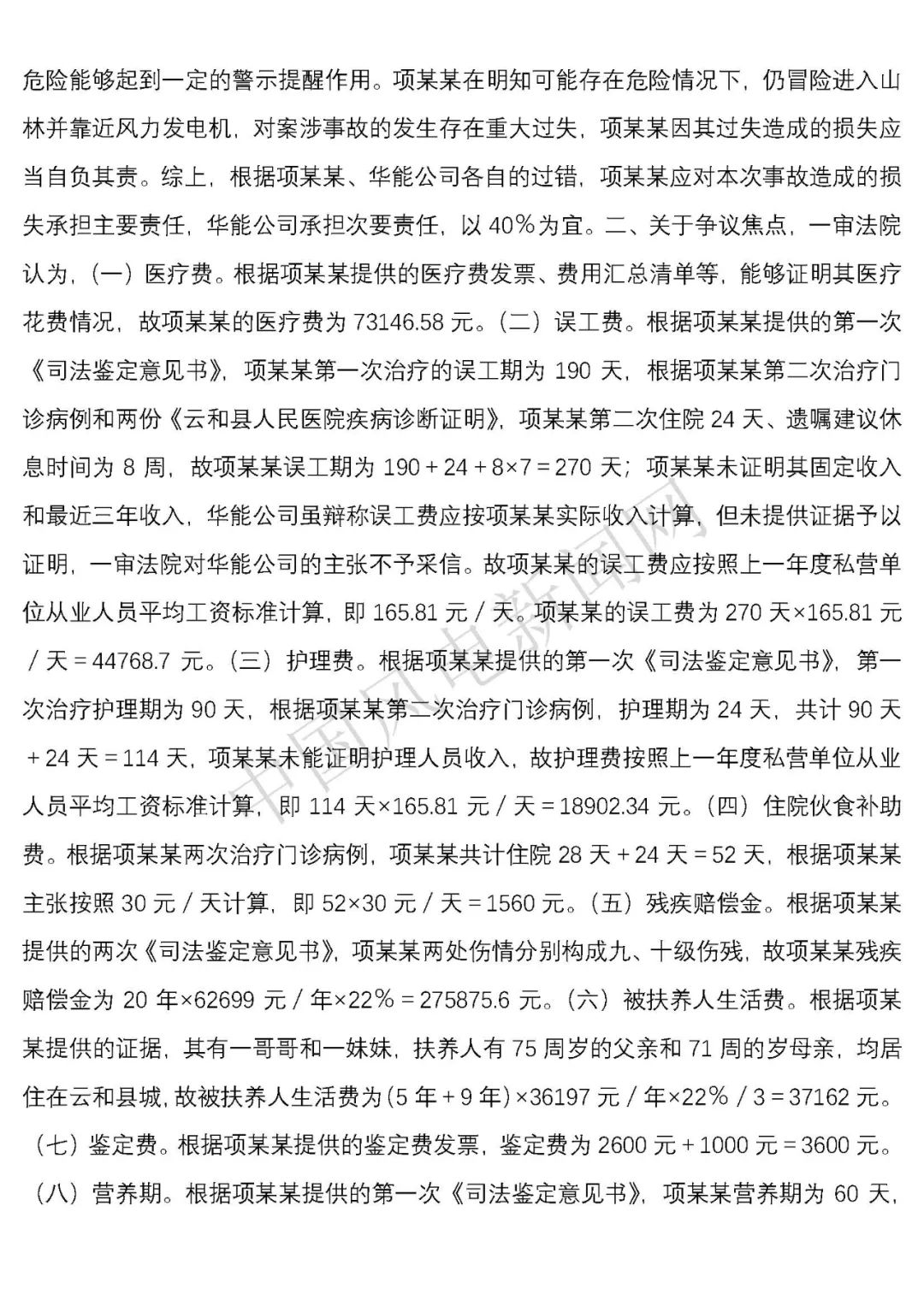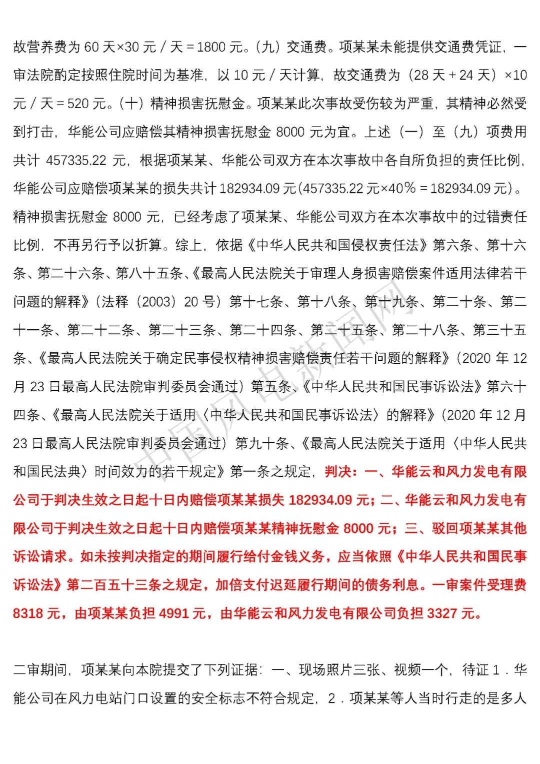 法院判決:一、華能云和風力發(fā)電有限公司于判決生效之日起十日內(nèi)賠償項建英損失182934.09元;二、華能云和風力發(fā)電有限公司于判決生效之日起十日內(nèi)賠償項建英精神撫慰金8000元;三、駁回項建英其他訴訟請求。