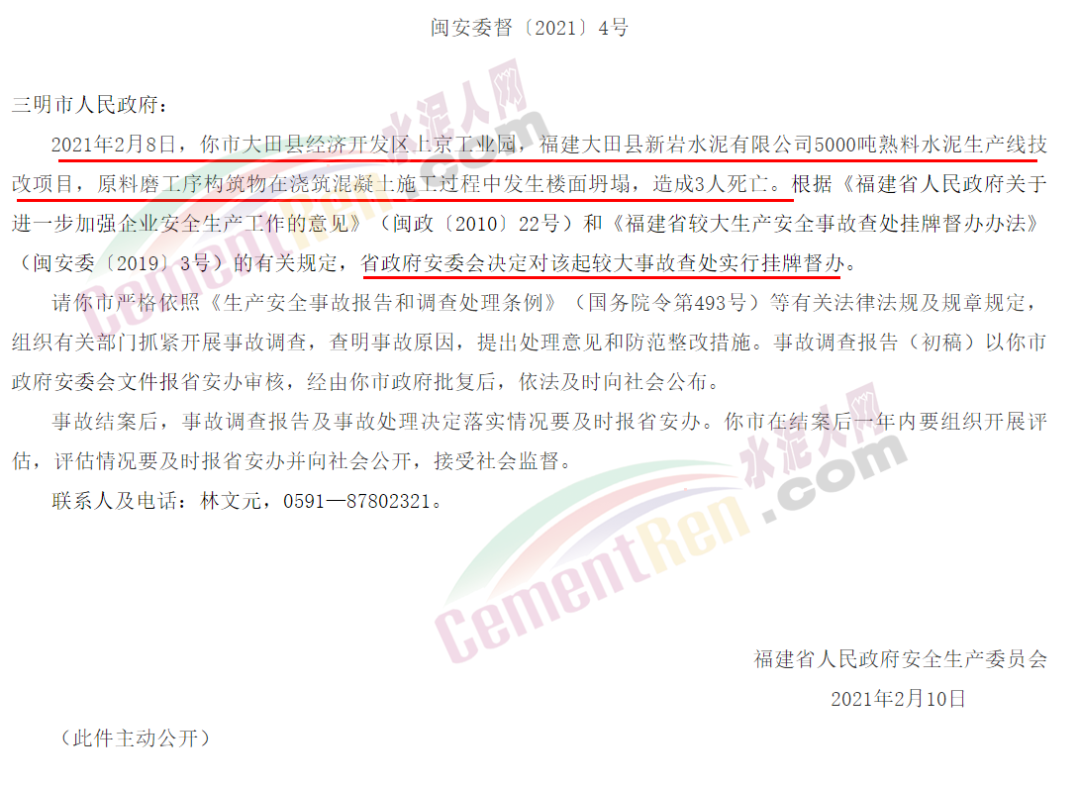 據(jù)水泥人網(wǎng)了解,福建省應(yīng)急管理廳發(fā)布較大生產(chǎn)安全事故查處掛牌督辦通知書(shū)(三明大田2.8水泥技改項(xiàng)目施工過(guò)程樓面坍塌事故)稱(chēng),2021年2月8日,三明市大田縣經(jīng)濟(jì)開(kāi)發(fā)區(qū)上京工業(yè)園,福建大田縣新巖水泥有限公司5000噸熟料水泥生產(chǎn)線(xiàn)技改項(xiàng)目,原料磨工序構(gòu)筑物在澆筑混凝土施工過(guò)程中發(fā)生樓面坍塌,造成3人死亡。 依據(jù)有關(guān)規(guī)定,福建省政府安委會(huì)決定對(duì)該起較大事故查處實(shí)行掛牌督辦。