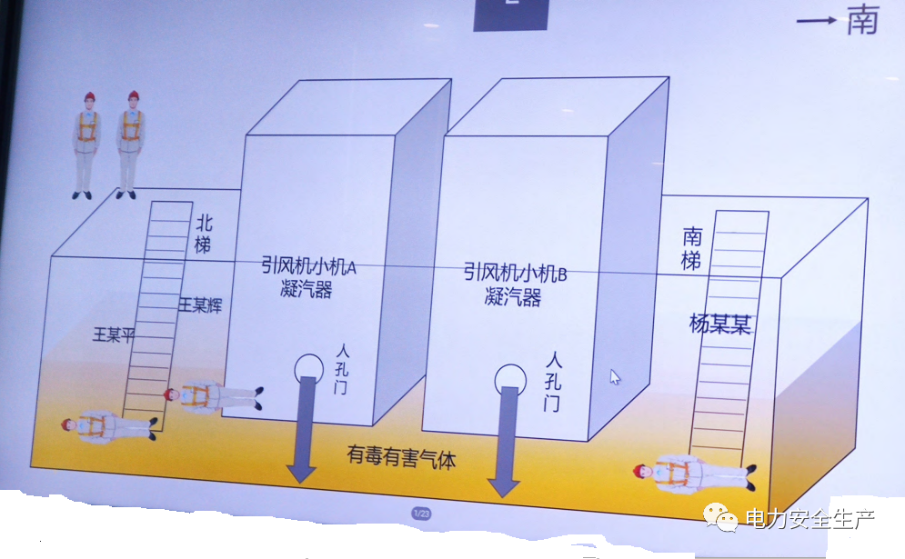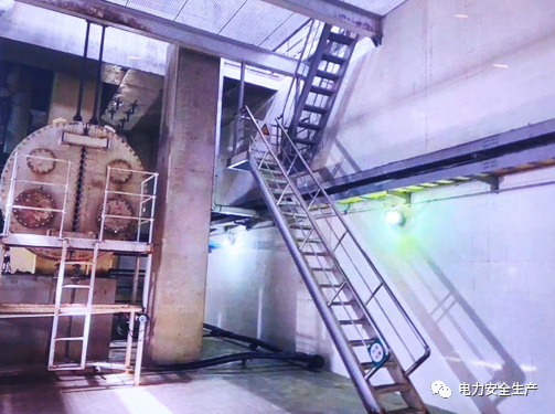 15:40安潔公司楊某某等4名作業(yè)人員,從#4機(jī)組汽動(dòng)引風(fēng)機(jī)室北側(cè)鋼步梯依次走下凝汽器區(qū)域準(zhǔn)備清理垃圾及取回相關(guān)工具,走在前面的王某某、王某某在下樓梯半途中暈倒并滑落至樓梯底部,走在后面的楊某某、王某某發(fā)現(xiàn)情況異常,隨即退至汽動(dòng)引風(fēng)機(jī)室外,并電話(huà)報(bào)告檢修部鄭某某。
