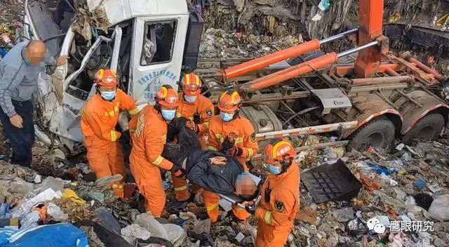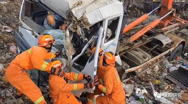 消防救援人員通過電話詢問現(xiàn)場報警人了解到,該垃圾車在卸載垃圾時抬升過高,導致滑入垃圾池內側翻,有1名人員被困。