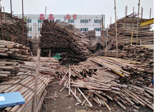 經(jīng)現(xiàn)場(chǎng)堪查,事故所在地現(xiàn)場(chǎng)堆放了大量鋼管及鋼笆片。鋼管堆垛支撐骨架由豎向三根鋼管(分左右兩側(cè)六根)、橫向三根鋼管組成,豎向鋼管與橫向鋼管通過(guò)扣件連接緊固,從而搭成一個(gè)支撐骨架。骨架搭建好后,便向上堆放散裝鋼管,每堆好一層鋼管(層高約75cm),便用橫向鋼管與豎向鋼管用扣件固定,共堆放6層,鋼管堆垛高約4.5m(0.75m×6層)。鋼笆片堆垛則較為凌亂,且部分鋼笆片未與鋼管堆垛分開(kāi)堆放。堆垛現(xiàn)場(chǎng)見(jiàn)下圖一。