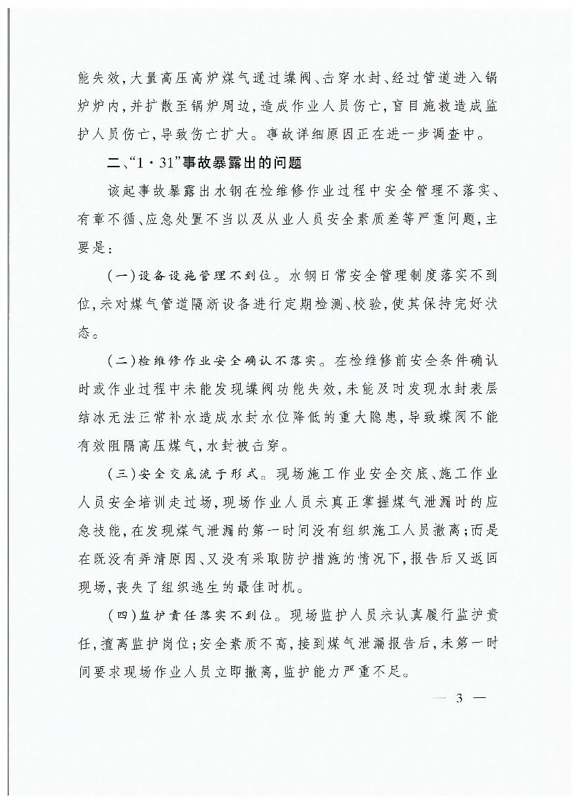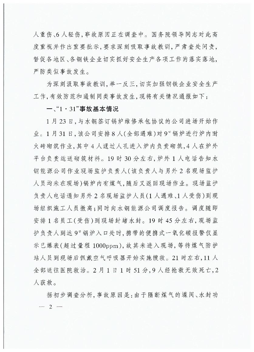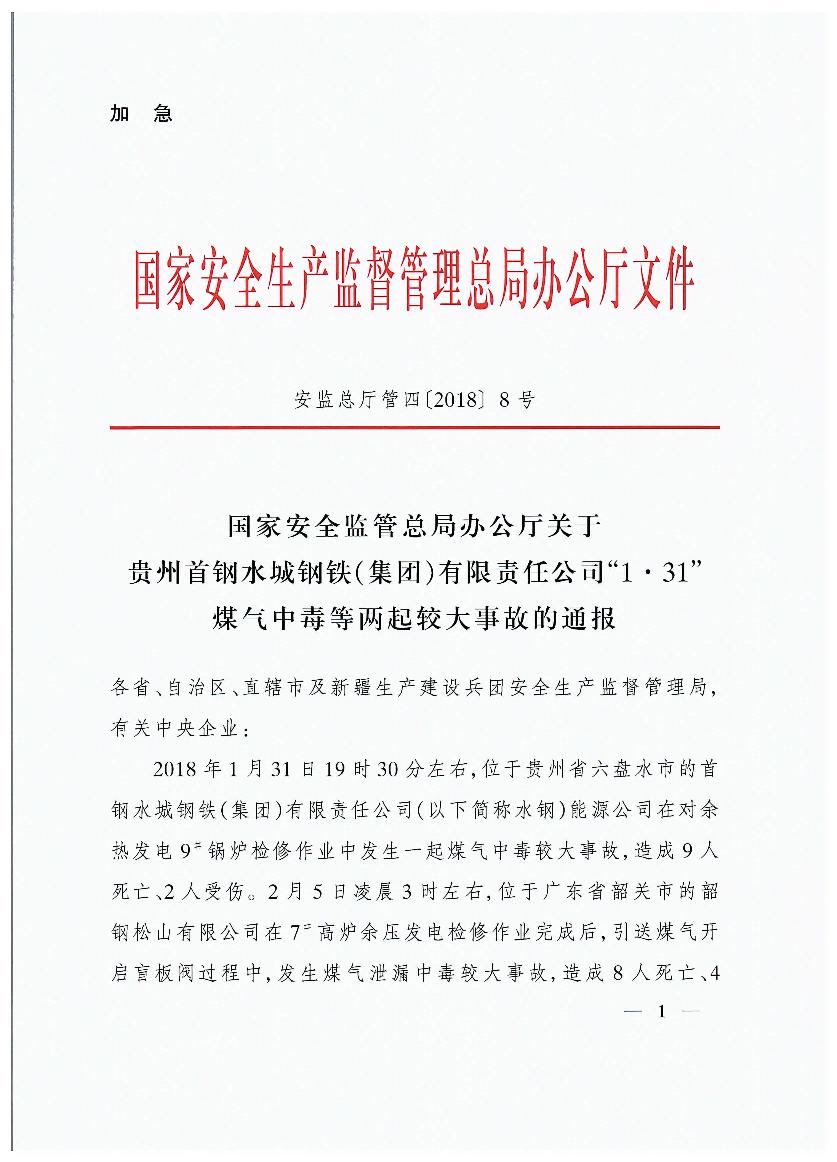 貴州首鋼水城鋼鐵(集團(tuán))有限責(zé)任公司“1?31”煤氣中毒等兩起較大事故的通報(bào)