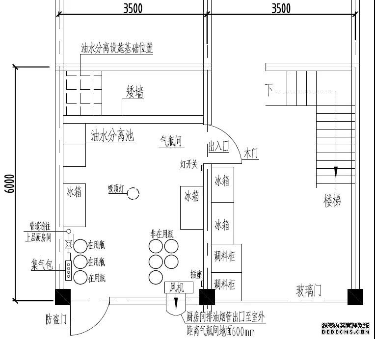 廚房間設(shè)置在氣瓶間樓上(東側(cè)建筑的二樓),南側(cè)由西往東依次擺放:雙眼炒灶、不銹鋼雙層工作臺、蒸煮爐、單頭矮仔爐、湯爐、頂上吊不銹鋼煙罩;東側(cè)由南向北依次擺放:蒸包子爐、不銹鋼水槽等。廚房間內(nèi)燃?xì)忮冧\鋼管從一樓氣瓶間西南角立管延伸至二樓廚房間,沿踢腳線敷設(shè)鍍鋅鋼管,管上裝有6個(gè)”三通”,通過“三通”和支管閥門連接燃?xì)庀鹉z軟管直供雙眼炒灶1臺,其他燃器具依次由DN25鍍鋅鋼管(輸氣總管)經(jīng)“三通”及角閥與家用調(diào)壓器連接二次減壓后,分別通到蒸煮爐2臺、單頭矮仔爐2臺、湯爐1臺、蒸包子爐1臺使用。