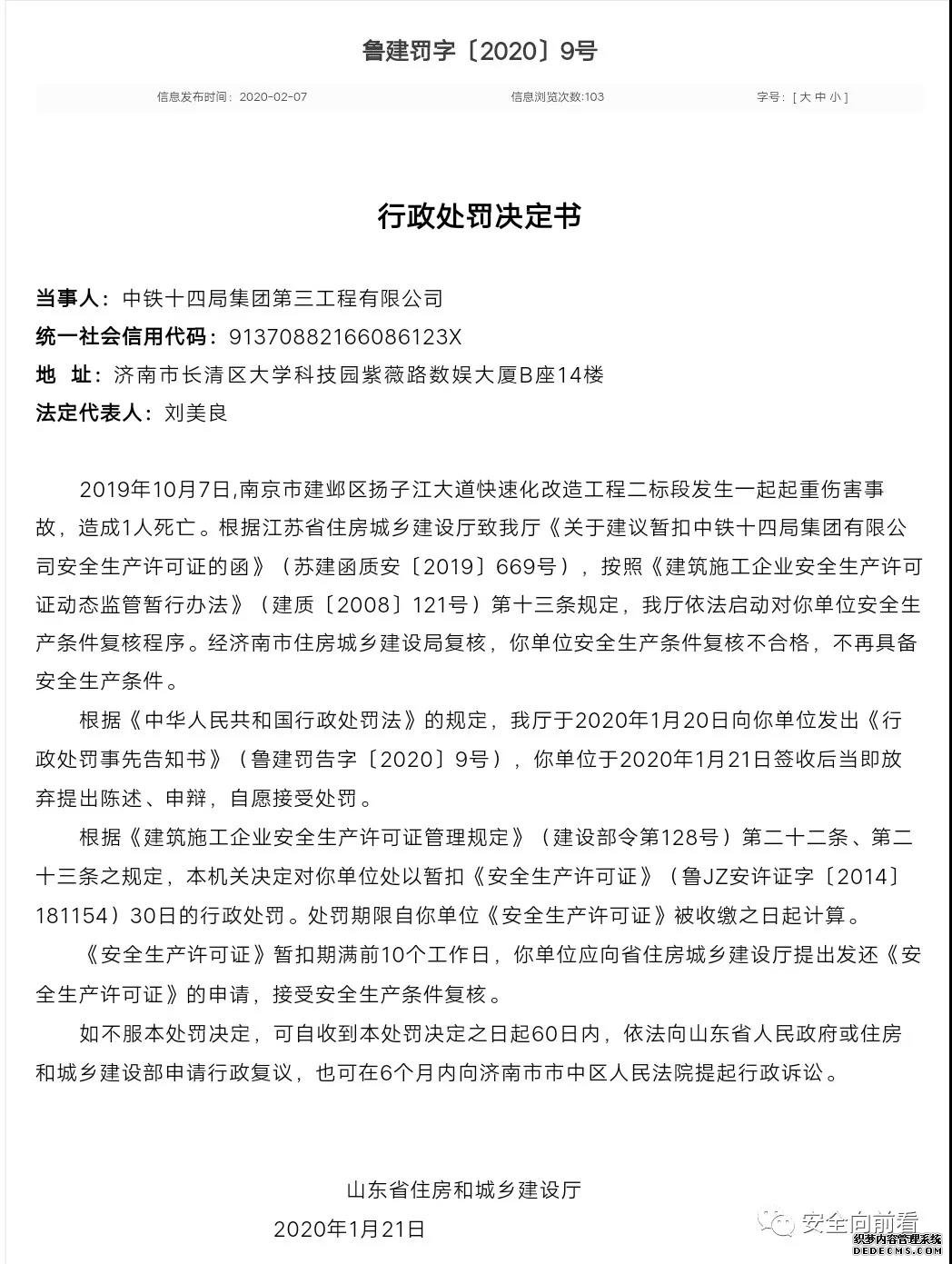 省住房城鄉(xiāng)建設(shè)廳魯建罰字〔2020〕9號行政處罰決定書顯示,2019年10月7日,南京市建鄴區(qū)揚子江大道快速化改造工程二標段發(fā)生一起起重傷害事故,造成1人死亡。根據(jù)江蘇省住房城鄉(xiāng)建設(shè)廳致我廳《關(guān)于建議暫扣中鐵十四局集團有限公司安全生產(chǎn)許可證的函》(蘇建函質(zhì)安〔2019〕669號),按照《建筑施工企業(yè)安全生產(chǎn)許可證動態(tài)監(jiān)管暫行辦法》(建質(zhì)〔2008〕121號)第十三條規(guī)定,我廳依法啟動對中鐵十四局三公司安全生產(chǎn)條件復核程序。