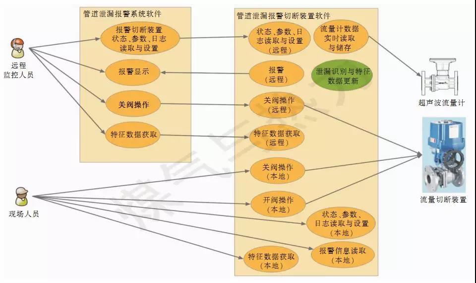 本系統(tǒng)選擇日本愛知AS超聲波流量計,為速度式流量計。其使用壓力小于等于1.0 MPa,防爆防護等級為EX ib IIB T4 Gb IP65,數(shù)據(jù)通信協(xié)議為RS485 MODBUS/RTU,精度等級為1.0級。超聲波流量計相較于其他類型流量計(如渦輪流量計),由于無轉(zhuǎn)動組件,不受慣性影響,對瞬時流量變化的靈敏度更高,且流量范圍較廣,始動流量較小,例如DN 50 mm口徑的超聲波流量計始動流量為0.37 m3/h,DN 100 mm口徑的超聲波流量計始動流量為1.25 m3/h。對小流量感知更靈敏,用于管網(wǎng)瞬時流量的監(jiān)測與捕捉,比較適合[5]。本系統(tǒng)選擇的遠傳裝置為山東思達特ST2000模塊,其負責太陽能電池系統(tǒng)供電管理和與燃氣公司的監(jiān)測平臺系統(tǒng)遠程通信。遠傳裝置采用RS485直讀方式從數(shù)據(jù)采集分析裝置獲取數(shù)據(jù),通過GPRS/CDMA無線通信進行遠傳,發(fā)送流量數(shù)據(jù)與報警信息,接收監(jiān)測平臺系統(tǒng)的指令,并下達到數(shù)據(jù)采集分析裝置。數(shù)據(jù)采集分析裝置與流量計、遠傳裝置、太陽能電池系統(tǒng)等連接。超聲波流量計自帶電池可單獨運行。整套供電系統(tǒng)可以正常運行6 a以上。 為實現(xiàn)流量監(jiān)測、泄漏識別、報警遠傳、遠程切斷等功能,系統(tǒng)軟件主要由本地管道泄漏報警切斷裝置軟件和遠端管道泄漏報警系統(tǒng)軟件兩部分組成。系統(tǒng)用例圖(軟件開發(fā)用于系統(tǒng)業(yè)務(wù)功能需求分析、系統(tǒng)建模的示意圖)見圖3,參與者包括:管道泄漏報警切斷裝置軟件、超聲波流量計、流量切斷裝置、管道泄漏報警系統(tǒng)軟件、遠程監(jiān)控人員、現(xiàn)場人員。其中,管道泄漏報警系統(tǒng)可以是其他的SCADA平臺系統(tǒng),這里只是為完成遠程泄漏監(jiān)測、報警、遠程切斷、參數(shù)設(shè)置等功能,所列舉的功能模塊。本文主要探討本地管道泄漏報警切斷裝置軟件的設(shè)計,即數(shù)據(jù)采集分析裝置主板的內(nèi)置程序,配合遠傳裝置實現(xiàn)相關(guān)功能。由圖3可知,管道泄漏報警切斷裝置軟件設(shè)計包括泄漏識別與特征數(shù)據(jù)更新,流量計數(shù)據(jù)實時讀取與儲存,狀態(tài)、參數(shù)、日志讀取與設(shè)置(遠程發(fā)送與本地操作),報警(遠程發(fā)送),關(guān)閥操作(遠程操作),特征數(shù)據(jù)獲取(遠程發(fā)送與本地操作),報警信息讀取(本地操作),開關(guān)閥操作(本地操作)等程序功能組成。遠程監(jiān)控人員通過SCADA系統(tǒng)進行遠程交互操作?,F(xiàn)場人員通過數(shù)據(jù)采集分析裝置按鍵、顯示屏、SD卡進行本地交互操作[6]。