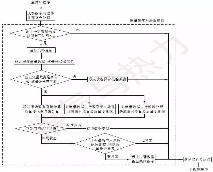 為實現(xiàn)上述功能,本地管道泄漏報警切斷裝置軟件程序邏輯架構(gòu)由基礎(chǔ)層、技術(shù)服務(wù)層、應(yīng)用層3層組成。基礎(chǔ)層包含各硬件操作的底層驅(qū)動程序,如數(shù)據(jù)采集分析裝置與流量計、遠傳裝置的RS485串口通信,SD卡數(shù)據(jù)的讀取與儲存,按鍵操作讀取等模塊。技術(shù)服務(wù)層為實現(xiàn)系統(tǒng)功能邏輯,提供相關(guān)的工具組件,調(diào)用基礎(chǔ)層的驅(qū)動程序接口,對數(shù)據(jù)進行解釋、加工處理,并向應(yīng)用層提供數(shù)據(jù)服務(wù)接口,方便功能邏輯的調(diào)用,包括開關(guān)閥指令處理、流量計數(shù)據(jù)采集與儲存、報警信息發(fā)送、報警數(shù)據(jù)儲存與讀取、參數(shù)信息儲存與讀取、數(shù)據(jù)的本地顯示、數(shù)據(jù)頻譜分析工具、時鐘校對等模塊。應(yīng)用層實現(xiàn)系統(tǒng)的邏輯功能,通過主循環(huán)程序周期循環(huán)調(diào)用流量采集與泄漏識別模塊、現(xiàn)場按鍵指令處理模塊、遠傳外部指令處理模塊,實現(xiàn)系統(tǒng)的自動運行與對外交互。主循環(huán)程序運行流量采集與泄漏識別模塊的程序流程見圖4。該部分為系統(tǒng)的核心功能之一,通過定時中斷程序?qū)崿F(xiàn)循環(huán)運行。進入主程序模塊后,首先判斷流量采集周期是否滿足,即當前時間距上一次流量采集時間是否滿足采集間隔(5 s),如果否,則跳出本次流量采集與泄漏識別操作;如果是,則執(zhí)行泄漏識別運行策略更新程序,檢查識別參數(shù)、指令是否有修改,并進行數(shù)據(jù)更新。從流量計獲取實時流量原始數(shù)據(jù)與狀態(tài)信息,檢查數(shù)據(jù)的有效性,例如報文中是否有報警或錯誤數(shù)據(jù),檢查流量計狀態(tài)是否正常。如果數(shù)據(jù)無效或流量計狀態(tài)不正常,則形成設(shè)備異常報警數(shù)據(jù),執(zhí)行信息儲存、遠傳。如果數(shù)據(jù)有效,則對數(shù)據(jù)進行計算處理及識別分析。計算處理過程包括3種方式,3種方式均通過原始流量數(shù)據(jù)計算某時段的流量累計值。對于原始流量變化比較平穩(wěn)即系統(tǒng)不存在調(diào)壓器喘振導(dǎo)致的流量頻繁波動時,可通過原始流量數(shù)據(jù)直接計算獲取流量變化率,速度較快,實時性較強。如果調(diào)壓器喘振導(dǎo)致流量波動干擾較大,則需要將喘振干擾部分濾掉后再進行下一步計算分析,可以對流量數(shù)據(jù)進行數(shù)字濾波處理或頻域分析處理,然后計算瞬時流量及流量變化率。數(shù)字濾波處理和頻域分析處理這兩種方法,去除干擾的原理不同,可以選擇其中一種方法,或兩者都使用,達到雙重保險的目的。這兩種方法實時性稍弱,但可有效降低喘振干擾造成的誤報。接下來判別當前運行狀態(tài),當數(shù)據(jù)采集分析裝置用于管網(wǎng)用氣規(guī)律搜集即學(xué)習(xí)階段時,程序不進行泄漏識別操作,而是直接生成并儲存用戶特征數(shù)據(jù)。當數(shù)據(jù)采集分析裝置用于管網(wǎng)泄漏監(jiān)測識別時,程序?qū)斍坝嬎憬Y(jié)果與用戶特征值進行比較,判別流量是否異常,當有異常時,形成報警數(shù)據(jù)甚至關(guān)閥指令,之后執(zhí)行信息儲存、遠傳等后續(xù)主程序指令,完成一次循環(huán)。