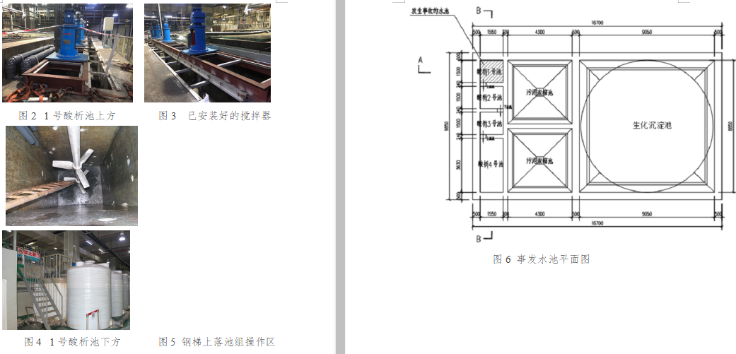 截至2019年5月14日,三期項目整體工程進度已完成70%左右,其中排放系統(tǒng)(廢水處理系統(tǒng))已完成45~50%。事故發(fā)生前,1、2、3、4號酸析池上方均已安裝好攪拌器,攪拌器采用角鋼及鐵架固定,未放水進行調(diào)試。(現(xiàn)場情況見圖2-5)