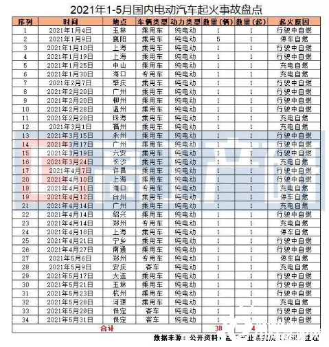 根據(jù)公告資料不完全統(tǒng)計,2021年1-5月國內共發(fā)生電動汽車起火事故34起,較去年同期增加20起;涉及車輛數(shù)目38輛,較去年同期增長73%,隨著國內電動汽車保有量的快速增長,起火事故備受業(yè)內關注。