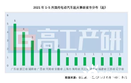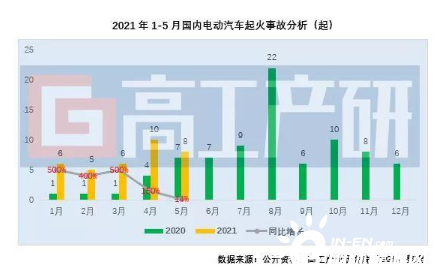 2021年1-5月國內共發(fā)生電動汽車起火事故34起,較去年同期增加20起;涉及車輛數(shù)目38輛,較去年同期增長73%。