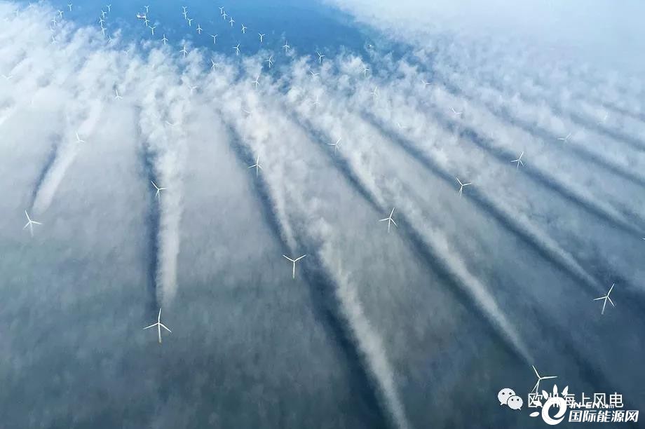 Horns Rev 1是全球第一座商業(yè)化規(guī)模的海上風(fēng)場(chǎng),最早由沃旭開(kāi)發(fā),安裝了80臺(tái)2MW Vestas風(fēng)機(jī),葉輪直徑80米,輪轂高度80米,總裝機(jī)160MW。場(chǎng)址所在位置風(fēng)功率密度398W / m2,最遠(yuǎn)離岸距離18公里,最大水深14米。下圖這張顯示風(fēng)機(jī)尾流影響的著名照片就來(lái)自于這座風(fēng)場(chǎng)。