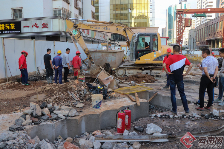 記者在現(xiàn)場(chǎng)看到,中鐵十八局、燃?xì)夤?、消防單位、交警單位、軌道公司等工作人員正在事發(fā)區(qū)域進(jìn)行搶修,一輛消防車(chē)??吭谑┕鷵鯄ν猓惠v標(biāo)有昆明煤氣的搶修車(chē)輛及兩輛標(biāo)有云南中石油昆侖燃?xì)獾娜細(xì)鈸岆U(xiǎn)車(chē)輛停在施工區(qū)域內(nèi),另有一臺(tái)挖掘機(jī)正在作業(yè),一旁的交通信號(hào)燈已經(jīng)熄滅,交警在交叉口指揮疏導(dǎo)通行車(chē)輛。