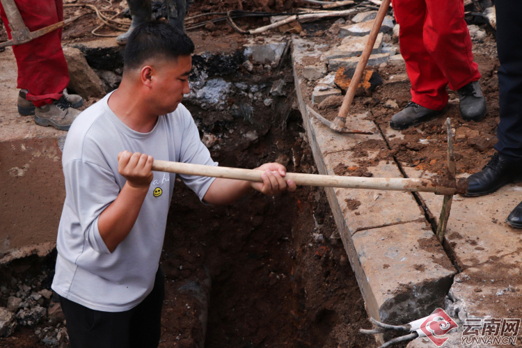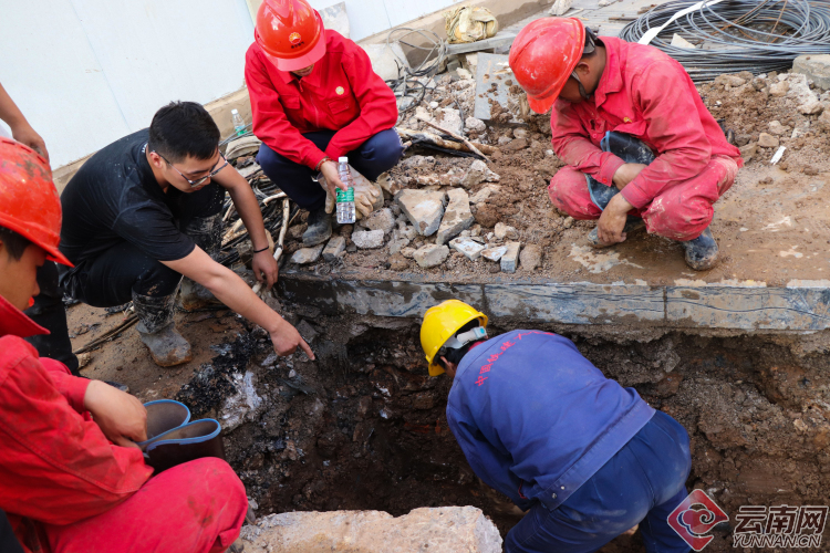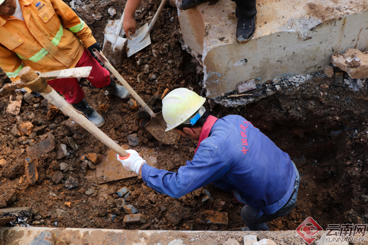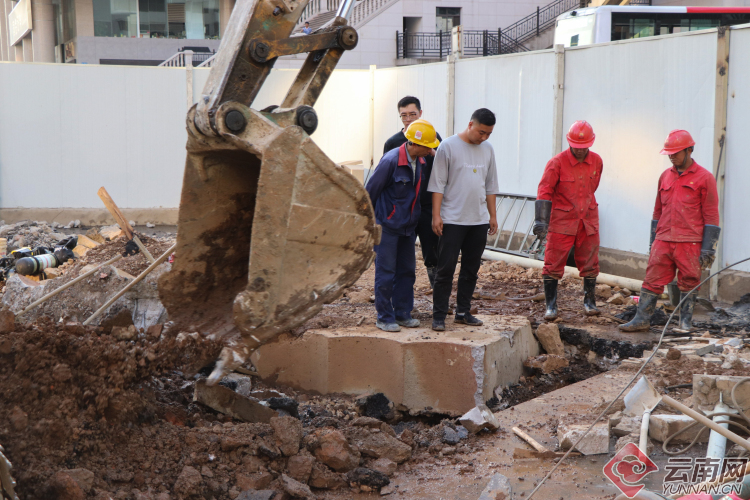 【昆明塘子巷天然氣泄漏】現(xiàn)場(chǎng):多部門(mén)聯(lián)手搶修 施工人員奮力挖掘破損管道