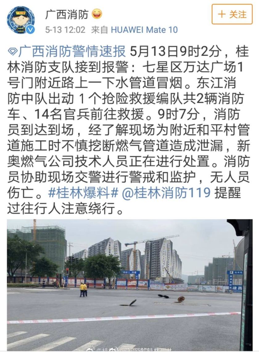 中午12時(shí),@廣西消防官微發(fā)布了一警情速報(bào):5月13日9時(shí)2分,桂林消防支隊(duì)接到報(bào)警:七星區(qū)萬達(dá)廣場1號門附近路上一下水管道冒煙。9時(shí)7分,消防員到達(dá)到場,經(jīng)了解現(xiàn)場為附近和平村管道施工時(shí)不慎挖斷燃?xì)夤艿涝斐尚孤?新奧燃?xì)夤炯夹g(shù)人員正在進(jìn)行處置。消防員協(xié)助現(xiàn)場交警進(jìn)行警戒和監(jiān)護(hù),無人員傷亡。