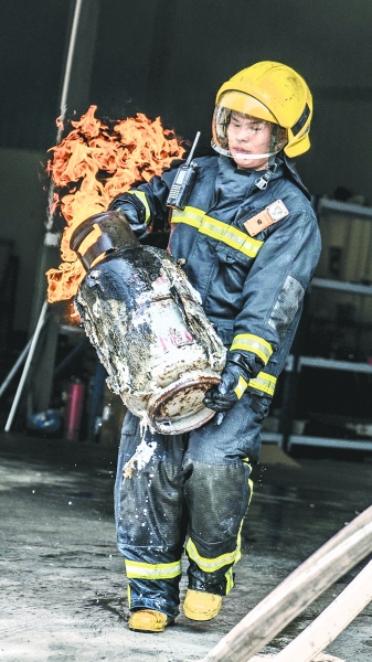 在水槍的掩護(hù)下,張曉明再次進(jìn)入火場。這時,他發(fā)現(xiàn)通向火場內(nèi)的通道中,擺放著一排液化氣罐,其中有幾個正在泄漏燃燒,如果不及時將它們轉(zhuǎn)移出去并安全處理掉,一旦發(fā)生爆炸后果不堪設(shè)想。