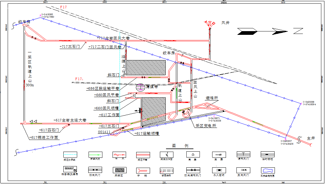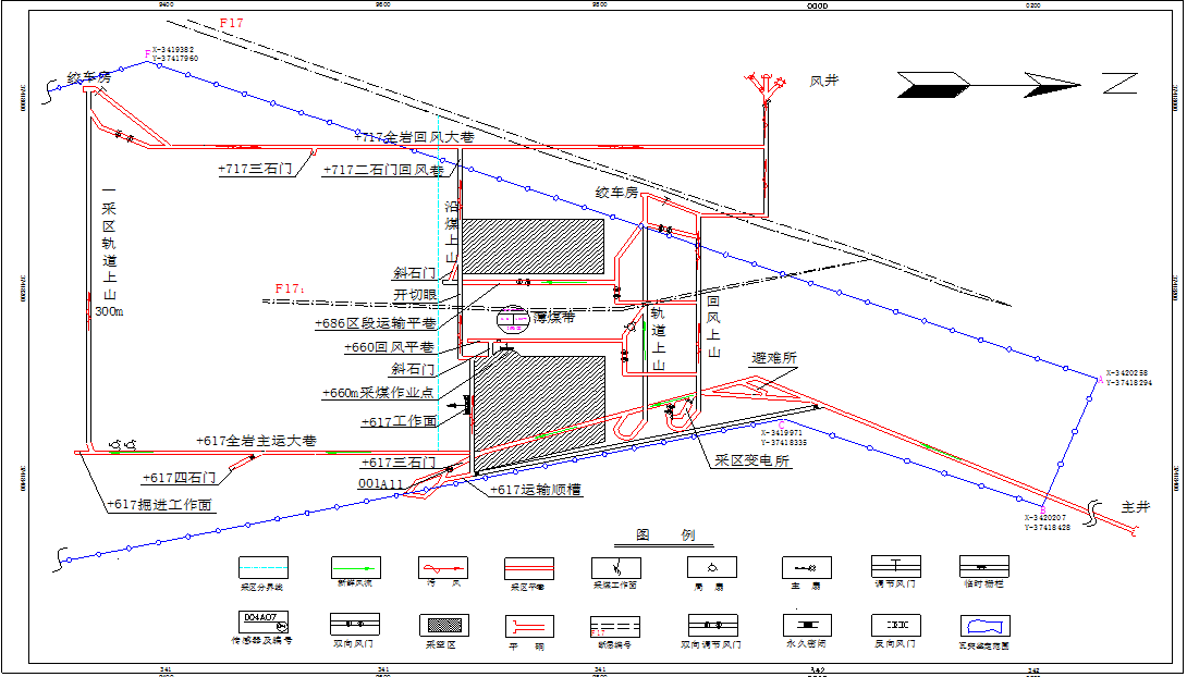 2.主要生產(chǎn)系統(tǒng)。礦井采用平硐上下山開拓,單水平布置。主平硐井口標(biāo)高+612.73m,副井井口標(biāo)高+761.70m,風(fēng)井井口標(biāo)高+758.94m。水平標(biāo)高為+617m,劃分為4個采區(qū)。其中,+617m水平以上設(shè)置Ⅰ、Ⅱ2個采區(qū),+617m水平以下設(shè)置Ⅲ、Ⅳ2個采區(qū)(見圖1)。礦井主平硐采用CTY2.5-GGB型蓄電池電機車運輸;通風(fēng)方式為中央邊界抽出式通風(fēng),風(fēng)井安裝2臺FBCZ-6-№12防爆抽出式通風(fēng)機,掘進工作面采用局部通風(fēng)機供風(fēng);礦井為單回路供電,配備100KVA柴油發(fā)電機作為備用電源,電壓等級為660V。礦井現(xiàn)生產(chǎn)區(qū)域位于礦區(qū)中部F17斷層以南的Ⅰ采區(qū)。受斷層影響,Ⅰ采區(qū)北部呈一狹長塊段,礦井將該塊段劃分出來,作為邊角煤采區(qū)進行獨立回采,即+617m采煤工作面,礦井編制了《邊角煤采區(qū)設(shè)計》。