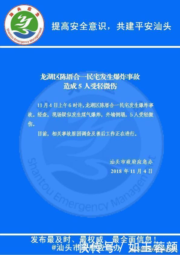 據(jù)“汕頭市政府應急辦”發(fā)布通報稱:2018年11月4日上午6時許,汕頭龍湖區(qū)陳厝合一民宅發(fā)生爆炸事故。經(jīng)查,現(xiàn)場疑似發(fā)生煤氣爆炸,外墻倒塌,5人受輕微傷。目前,相關事故原因調查及善后工作正在進行。