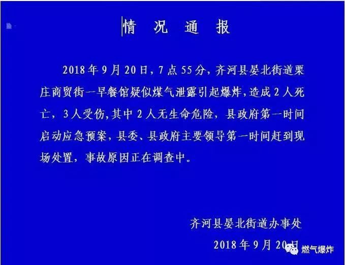 20日上午,10時(shí)左右,齊河縣晏北街道辦事處對(duì)外發(fā)布《情況通報(bào)》稱,2018年9月20日,齊河縣晏北街道栗莊商貿(mào)街一早餐館疑似煤氣泄漏引起爆炸,造成2人死亡,3人受傷,其中2人無(wú)生命危險(xiǎn),縣政府第一時(shí)間啟動(dòng)應(yīng)急預(yù)案,縣委、縣政府主要領(lǐng)導(dǎo)第一時(shí)間趕到現(xiàn)場(chǎng)處置,事故原因正在調(diào)查中。
