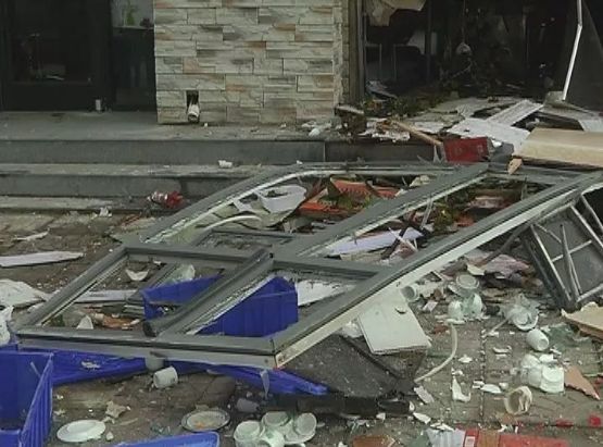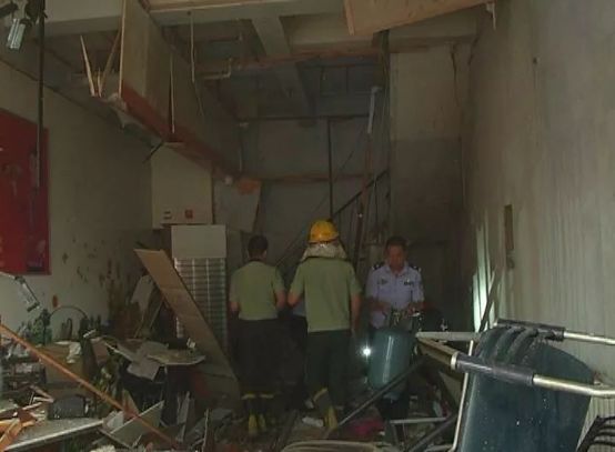 事故現(xiàn)場一片狼藉,飯店屋內的東西散落在人行便道上,馬路上也散落著許多的玻璃碎屑...