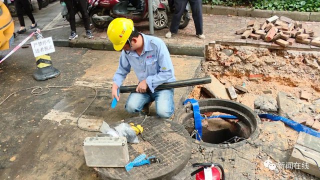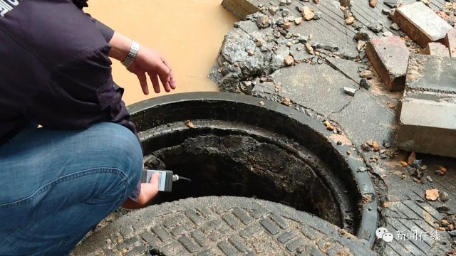 先不要敲,先不要敲,我們查一下濃度先,要不等一下(有)火花(發(fā)生)爆炸,這是雨水井啊,測一下濃度。這是雨水井,雨水井如果有氣進去了同樣會爆炸,現(xiàn)在地下也是有,還是有是吧,等一下散了才能敲。