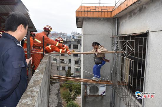 中隊指揮員仔細勘察現(xiàn)場周圍情況后,發(fā)現(xiàn)被困的一家人的樓層與相鄰的樓層只隔了1、2米的距離,于是決定從對面樓層將被困人員營救出來。消防官兵找來單杠梯和木板搭在被困人家的窗口,然后再將備好的腰帶扔到對面,讓他們系好,腰帶則用繩索在另外一邊固定。為了讓他們穩(wěn)住重心,防止摔倒,消防官兵又找來另外一條木棍架在窗與圍墻之間,讓他們可以扶著過來。消防官兵一邊穩(wěn)住被困人員的情緒,一邊謹慎得操作著,將被困人員身上的保險緊緊拴牢,防止意外事故的發(fā)生。待被困人員快到圍墻邊,消防官兵則立即用手拉住他們,抱了上來。在經過讓人窒息的20多分鐘后,一家5口終于有驚無險的被救了出來。