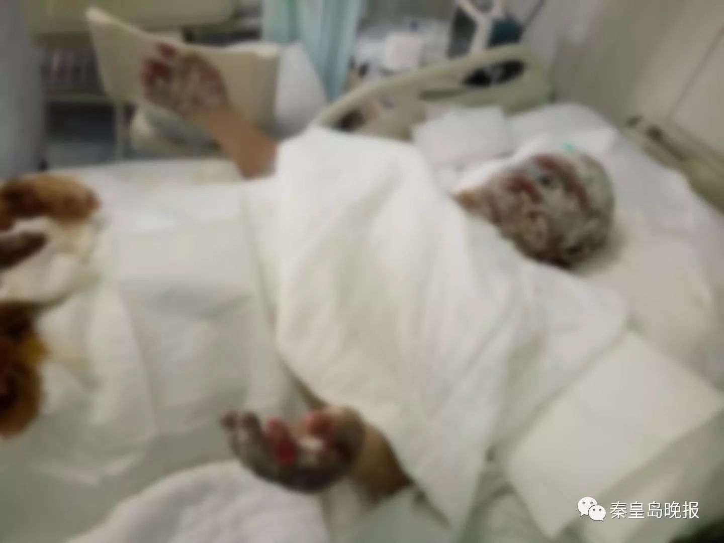 在這間潔凈、有著精密治療儀器的病房里,李偉鵬父母的病床是相鄰的4床和5床,中間只隔著1條1米多寬的通道。愛(ài)漂亮的母親沒(méi)了滿頭秀發(fā),臉上布滿燒傷痕跡,裸露在外的皮膚都纏裹著厚厚的紗布。曾經(jīng)意氣風(fēng)發(fā)的父親五官腫脹變形,眼睛腫成一道縫。