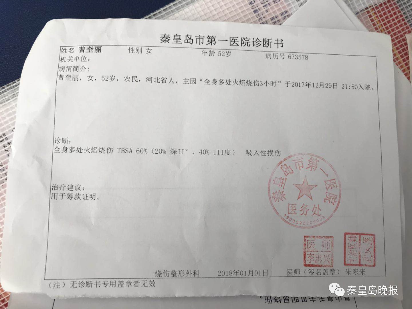 2017年12月29日,李偉鵬最不愿意回憶的一天——父母在青龍滿族自治縣龍王廟鄉(xiāng)經(jīng)營(yíng)的小餐館煤氣罐泄漏爆炸引發(fā)火災(zāi),在火海中掙扎的父母被鄰居救出送往醫(yī)院,全身大面積燒傷,傷情更為嚴(yán)重的母親燒傷面積達(dá)60%。