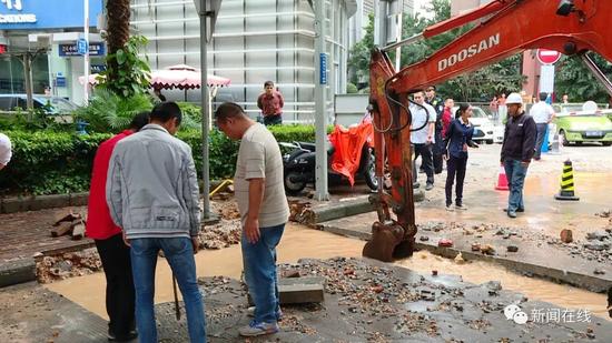 為了防止爆炸,消防部門在現(xiàn)場(chǎng)處置時(shí)使用了大量的水,而這些水積滿了現(xiàn)場(chǎng)開挖的土溝,于是,施工方準(zhǔn)備利用窨井進(jìn)行排水,看到這種情況,現(xiàn)場(chǎng)搶修人員趕緊喊停。