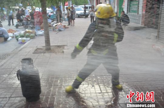 雖然水槍朝著液化氣罐持續(xù)射水,但已被燒成漆黑的罐體仍舊很燙。為了讓氣罐遠(yuǎn)離明火,劉愛文拎起氣罐將其轉(zhuǎn)移至室外安全地帶。在拎著氣罐向室外狂奔的過(guò)程中,水槍一刻未曾離開他和他手中的氣罐,最大限度確保其安全。