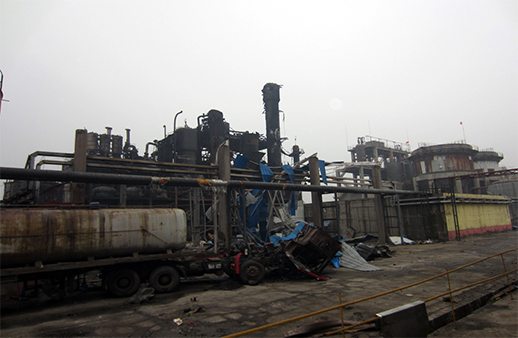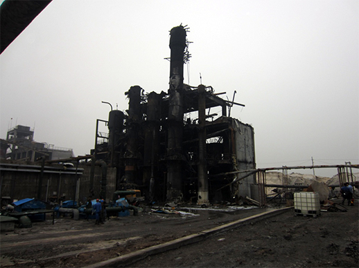 | 8月25日 | 18:46:22 | 氧化塔爆炸,并相繼引燃了氧化塔周邊氫化塔、萃取塔等設(shè)備中的物料。爆炸導(dǎo)致在四層平臺取樣的張某、一層北側(cè)檢查的秦某和程某當(dāng)場死亡;并導(dǎo)致雙氧水車間南300米的氯堿車間氯氣管道受損,造成少量氯氣泄漏;爆炸碎片和泄露的氯氣導(dǎo)致雙氧水車間辦公室朱康康,中控室鄭某、金某、秦某,氯堿車間荊某、秦某和水泵房張某等7人受傷。 |