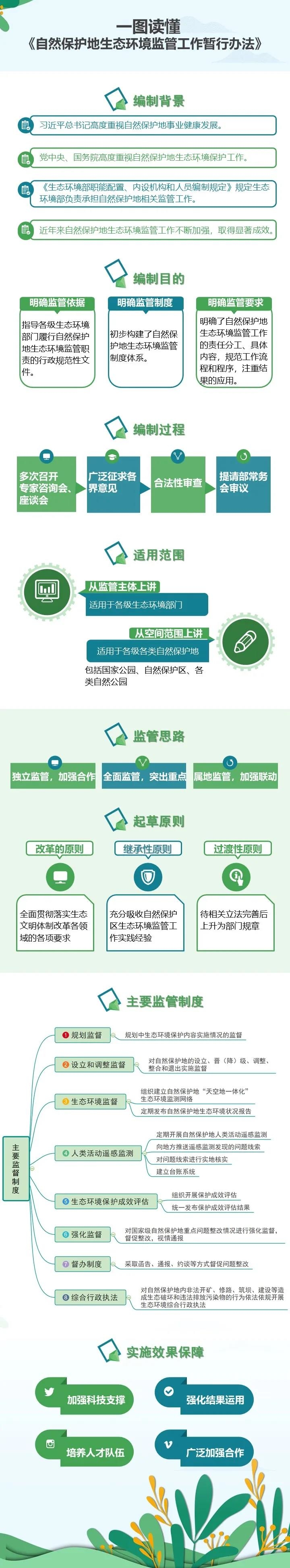 在這樣的背景下,生態(tài)環(huán)境部組織編制了《暫行辦法》,是深入貫徹習近平生態(tài)文明思想,有效落實黨中央國務院關于自然保護地事業(yè)改革各項重大部署,切實履行自然保護地生態(tài)環(huán)境監(jiān)管職責的重要舉措。其主要目的,一是明確監(jiān)管依據 ,《暫行辦法》是指導各級生態(tài)環(huán)境部門履行自然保護地生態(tài)環(huán)境監(jiān)管職責的行政規(guī)范性文件;二是明確監(jiān)管制度,《暫行辦法》初步構建了自然保護地生態(tài)環(huán)境監(jiān)管制度體系;三是明確監(jiān)管要求, 《暫行辦法》明確了自然保護地生態(tài)環(huán)境監(jiān)管工作的責任分工、具體內容,規(guī)范工作流程和程序,注重結果的應用。
